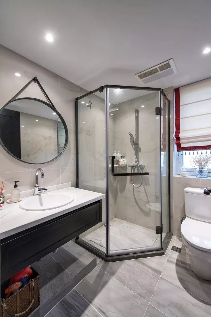 客卫的空间质感跟主卫类似的现代时尚,干净简洁的钻石型淋浴房,搭配洗手盆前方这面圆形的装饰镜,整个空间都显得格外的创意时尚大方。