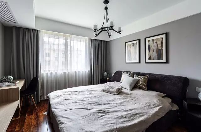 高级灰色调的主卧,搭配黑色及白色,打造成一个符合现代年轻人审美的卧室空间。