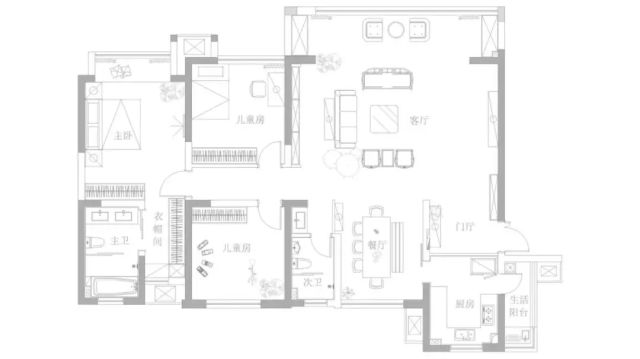 本案150㎡的三室现代新中式混搭风格,采用环保的材料,尽量用全实木来营造整个家居空间,为两个宝宝营造一个自然的成长环境。