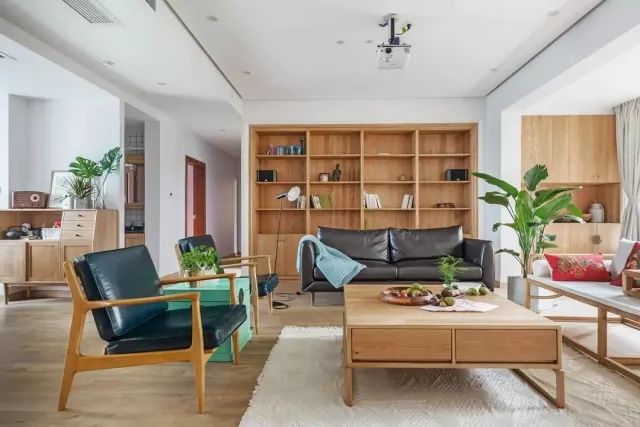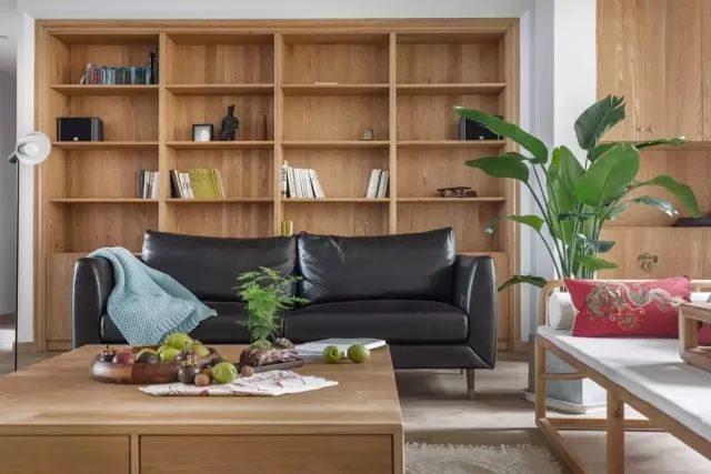 客厅选择了三人位的深色皮质沙发,方便打扫,同时也增加了家里的现代感,衬托背后的书柜,不会显得过于古朴。旁边搭配了两把新中式的皮椅,造型有别于传统中式的单椅,但是造型又融入了木质,木质搭配皮椅,是中式和现代的结合。客厅顶面没有主灯,采用的全辅光源,这样更柔和。