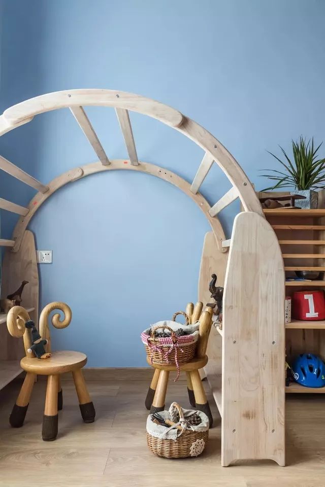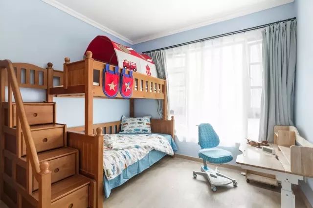 儿童房采用色彩上更加明显的蓝调子,双层实木床以及梯子上的抽屉,都让房间趣味十足。