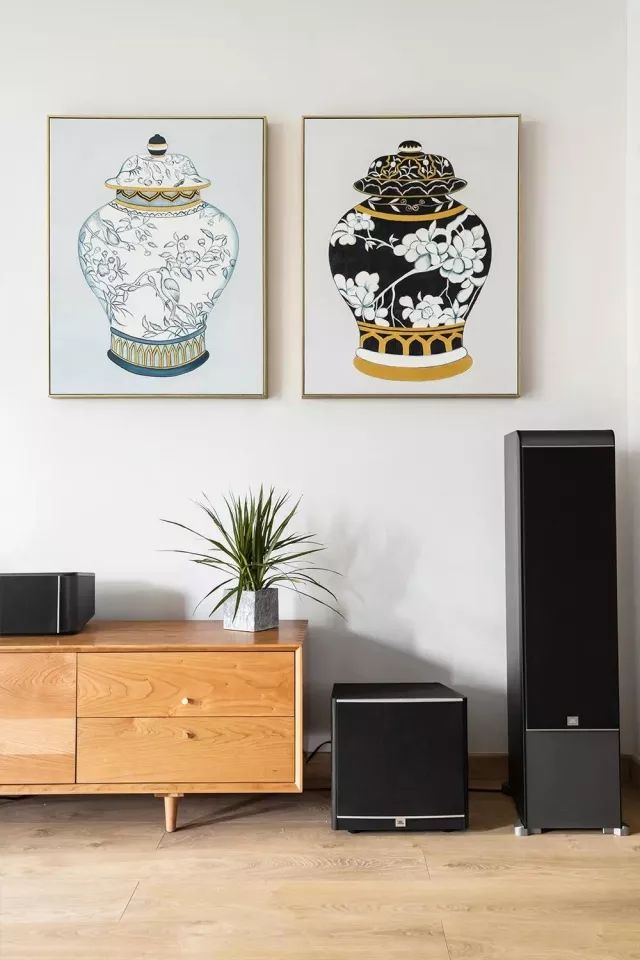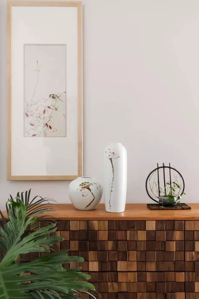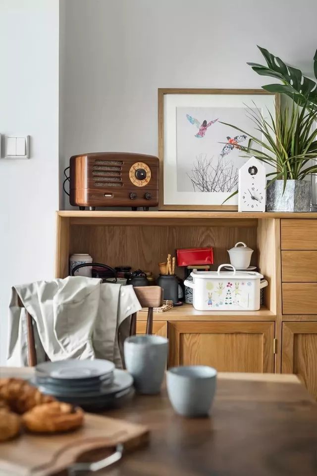 餐边柜摆放两个龟背植物与画,在浅色墙体上更加彰显立体感,同时呼应更纵深的内部空间。
