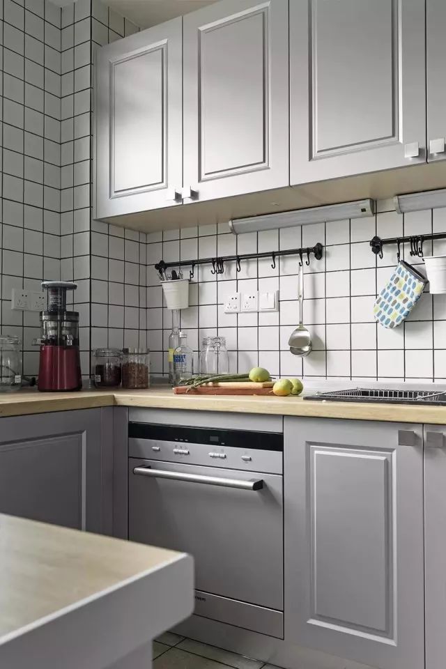 厨房用了覆膜材质的蓝灰色柜门面板,台面没有选用常规的石英石台面,而是选择的仿木纹的台面,加白色小方砖,方便打扫,多排吊柜易于收纳符合厨卫空间的清爽洁净感,又与整体调性协调一致。