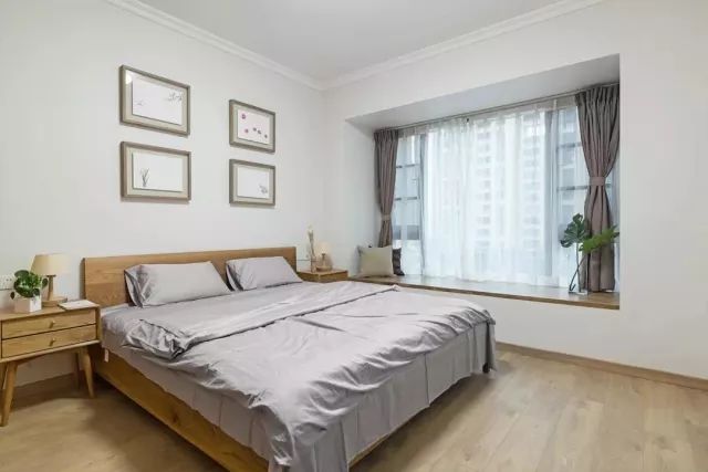 主卧简洁的木色家具加地板,风格统一,增加了卧室空间的温馨感。