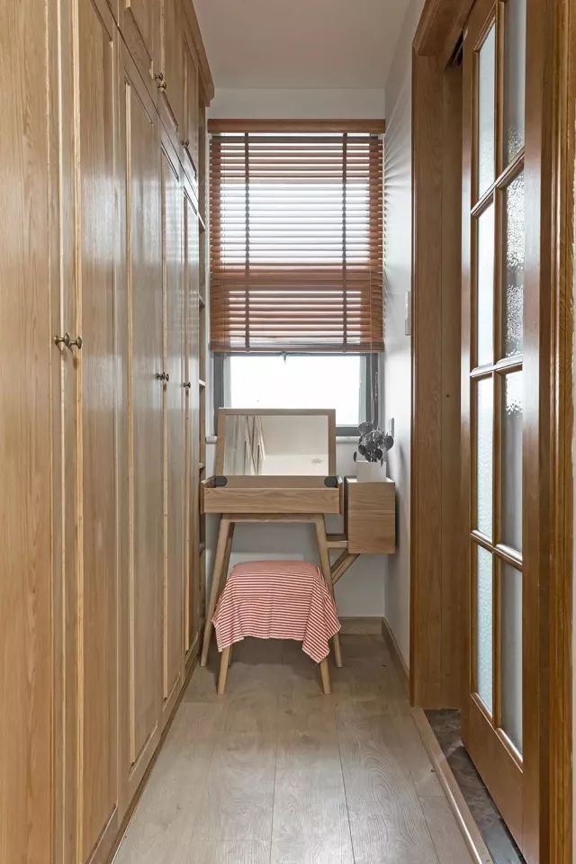 为了让卧室更加干净整洁,所以选择了在衣帽间放置具有储物功能的化妆柜,在空间收纳性上做足文章。为了让化妆柜旁边的柜子更好取物,所以侧面用了隔板来制作。木质百叶窗让光线更多变化。