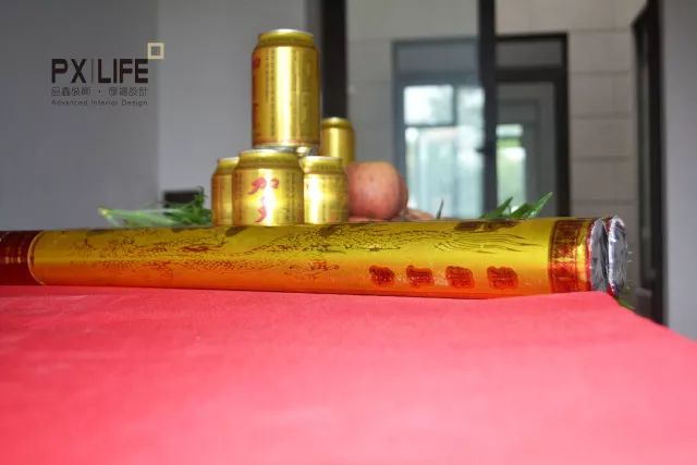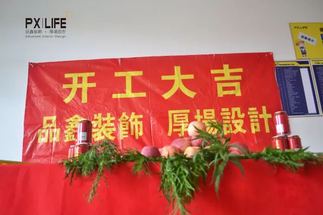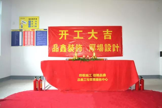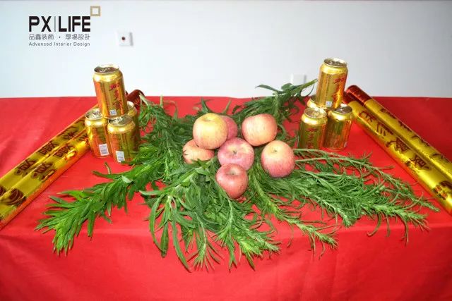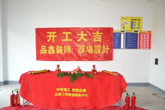 现场准备齐全。红色的开工大吉条幅、礼炮、饮品、水果,寓意红红火火,顺顺利利。