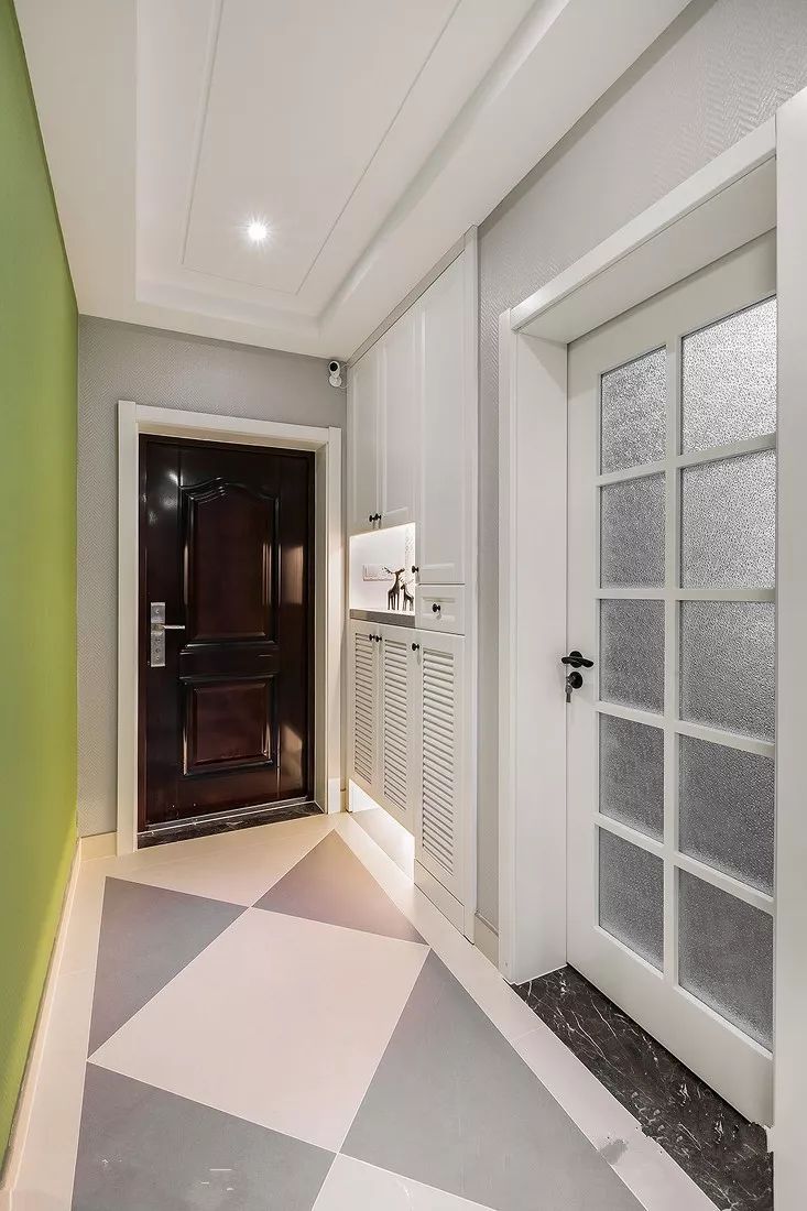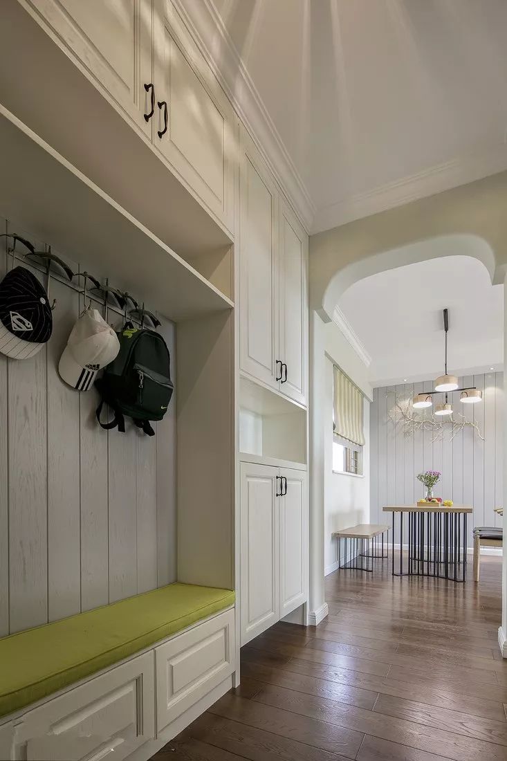 嵌入式鞋柜一般是和进门吊顶结合设计的,不仅美观实用而且可以大大节省室内空间。利用墙面的空间,在考虑墙体的承重范围下,在玄关处设计嵌入式鞋柜,能够保证鞋柜足够安全。