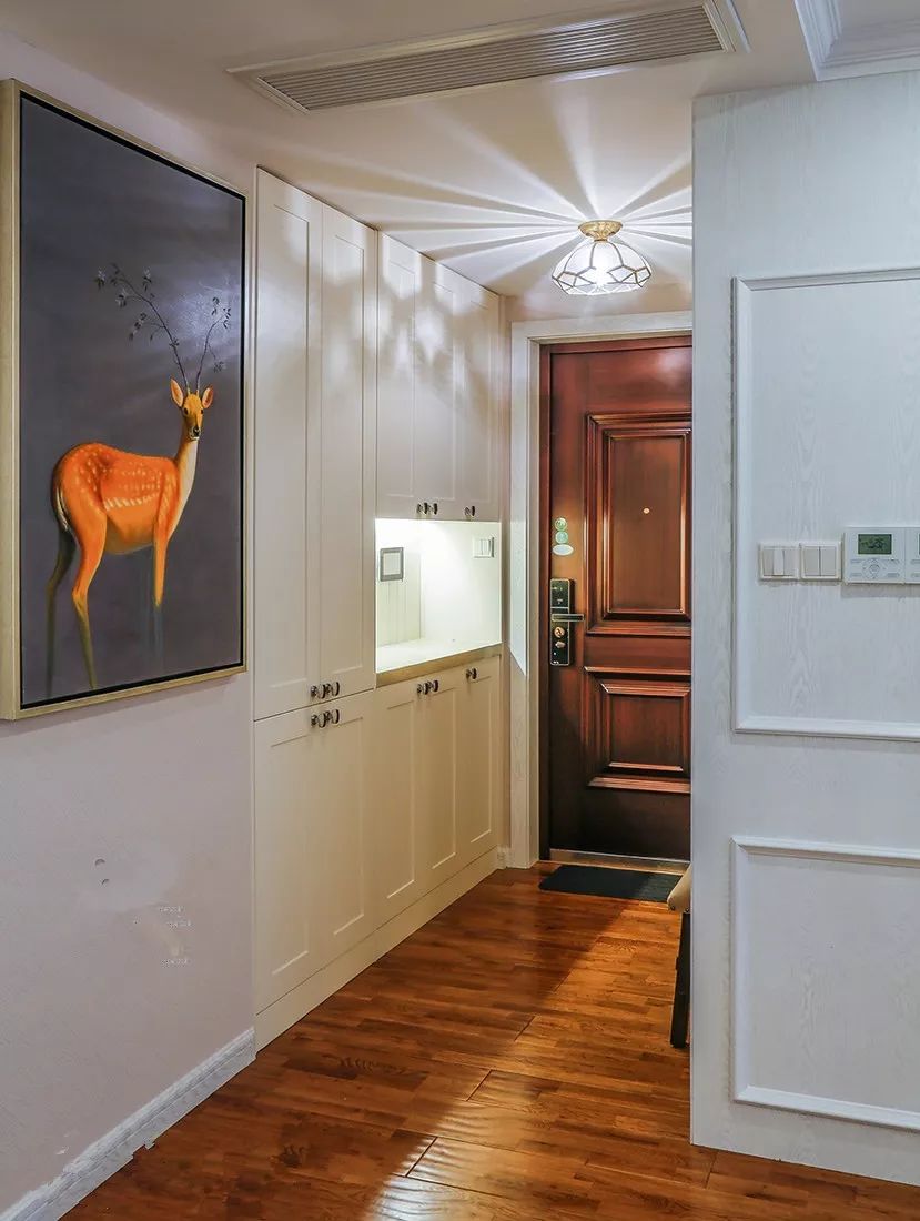 这样中间和柜底悬空的设计,中间放绿植、相框、钥匙、零钱的,底部放常穿的鞋子,其他封闭起来的柜子都可以当做收纳柜。