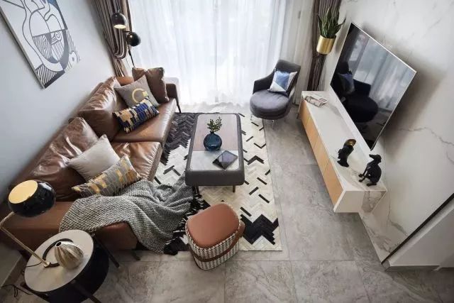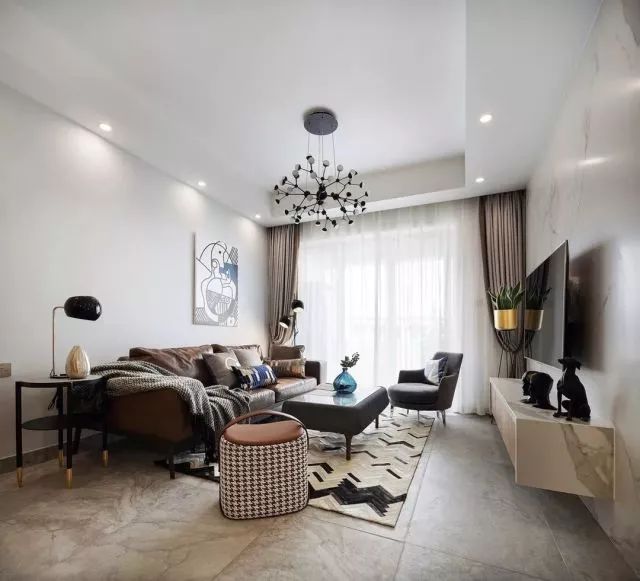 客厅以白色为主调,棕色为辅。打造了一间沉稳不失绅士风度感觉的惬意空间。金属元素的小摆件、盆栽、桌脚,为空间增添一些亮眼的细节,极具现代时尚感,简约却不单调。