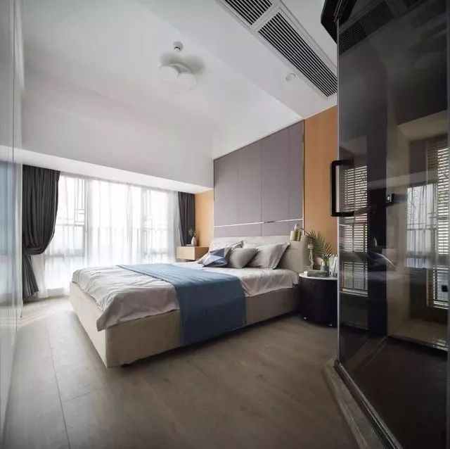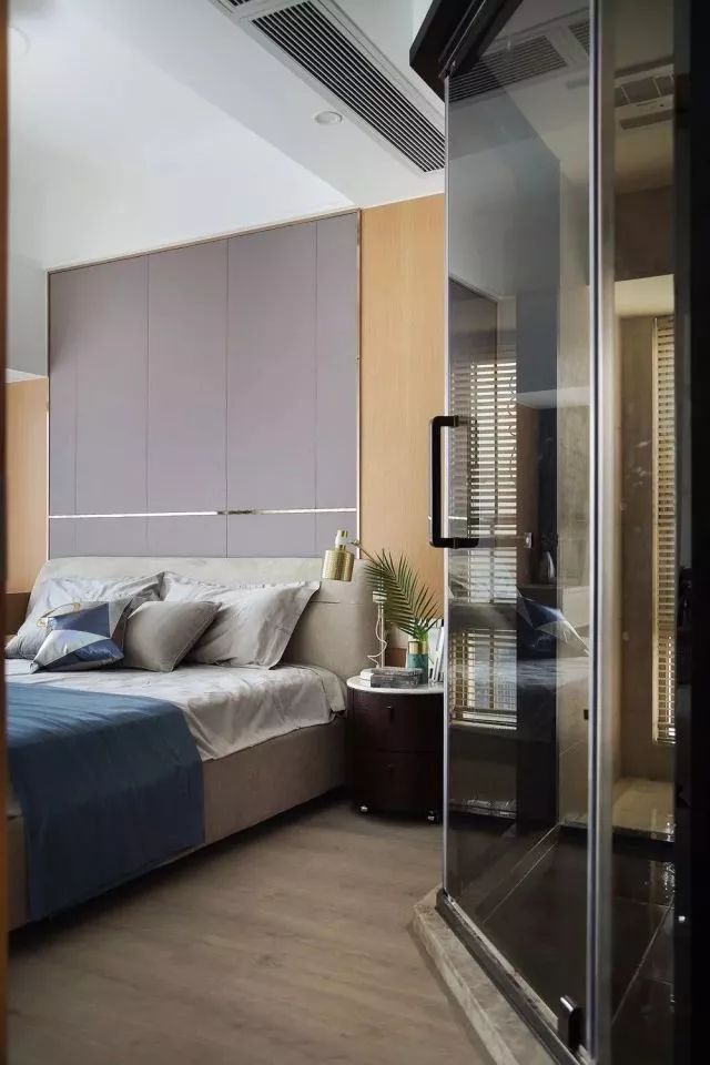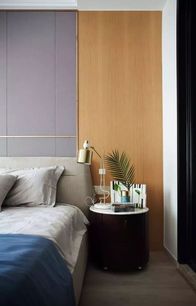 卧室以暖色调为主,灵活运用木色、暖灰和蓝色的搭配,打造了一个温馨助眠的空间。