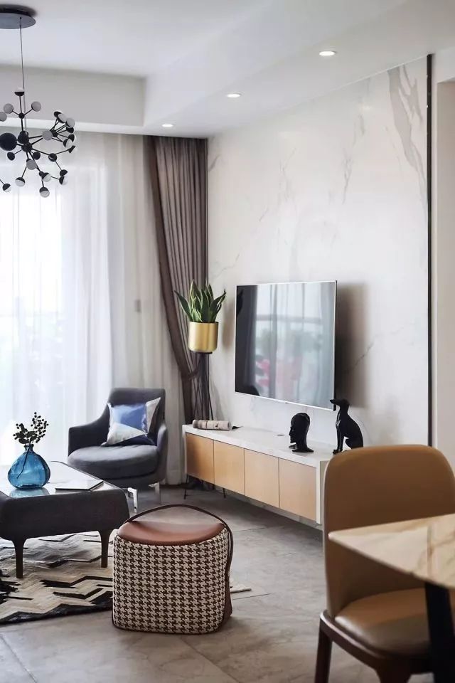大理石电视墙以其自然纹路作为装饰,配上相同元素的地板,整体简洁大方,有种返璞归真的天然韵味。