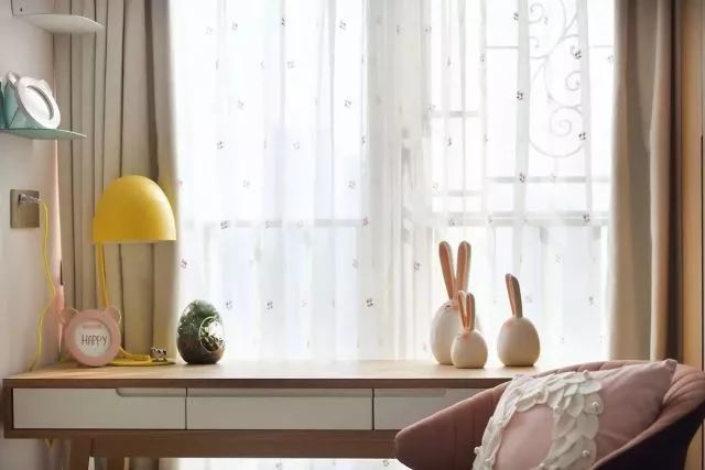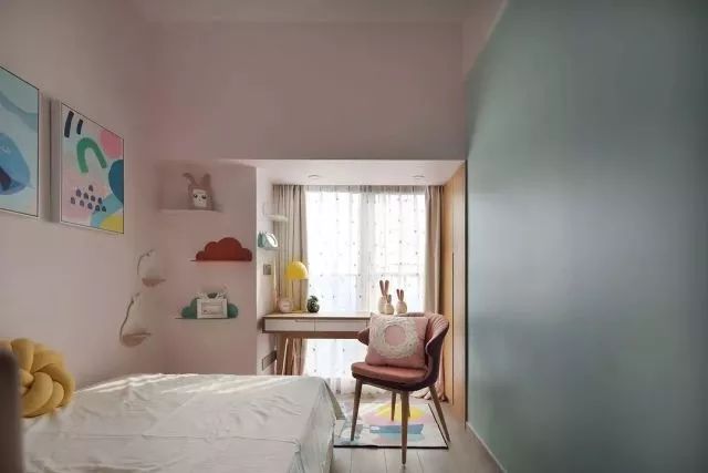 儿童房的墙面特意设计成两种对比色,打破常规理念,通过合理的色相及面积选取,创造性的实现了空间的协调氛围,整体呈现清新活泼、童话式的奇妙意境,这是属于孩子的创想乐园!