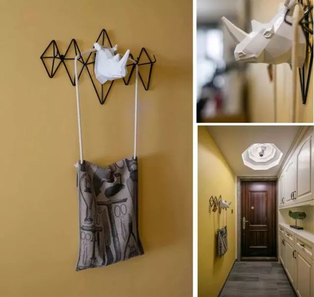 玄关处一半采用明快的黄色,一半采用纯净的白色。小动物形状的挂件既充当了挂物品的功能,又起到装饰的作用。