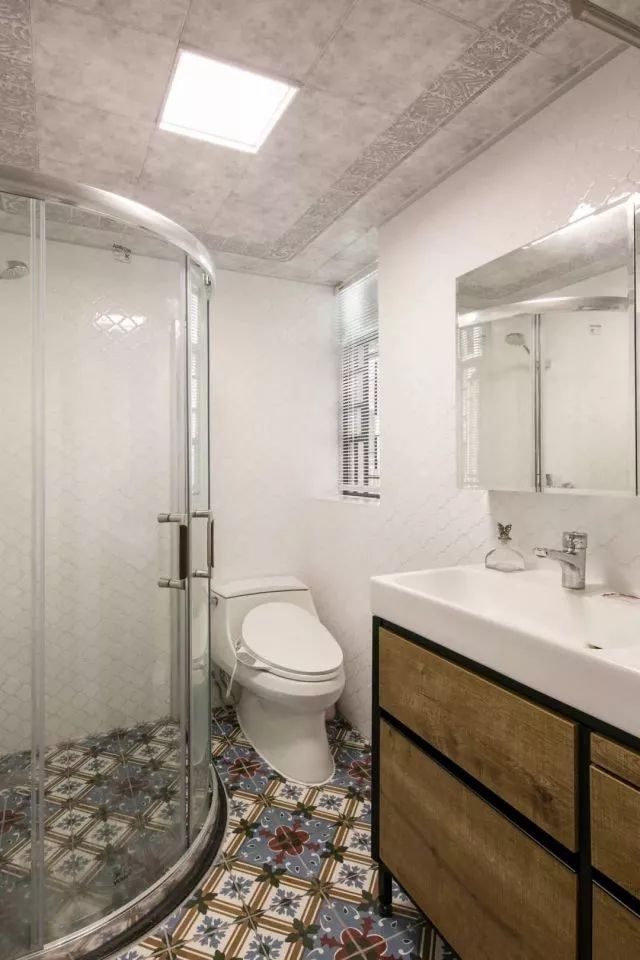 地面个性时尚的花砖与墙面的宫灯砖,浴柜的设计更是脱胎换骨台面上按钮、右侧的垃圾箱的设计,让跟随“主流”的人们细细咀嚼设计的变幻莫测。