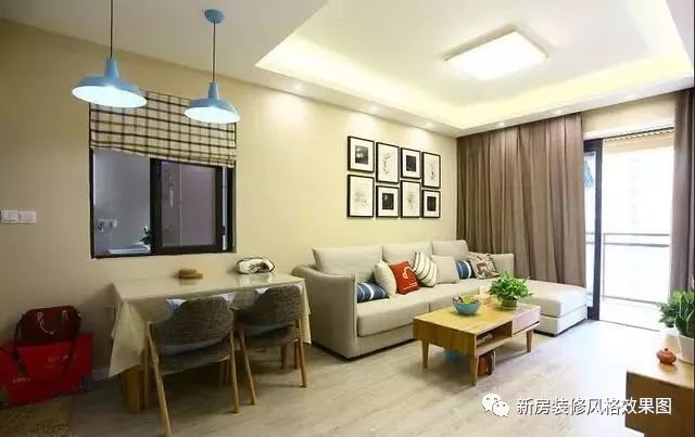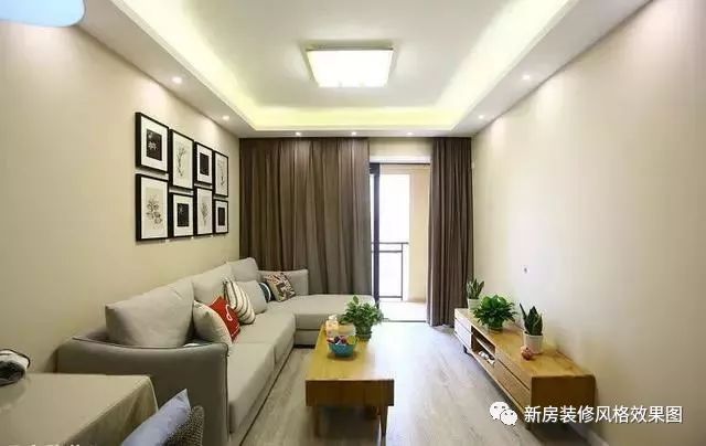 客厅两面背景墙,都简单刷了墙漆,沙发墙有用挂画装饰,这样不单调就行。L型布艺沙发,搭配原木色茶几,电视柜,这样自然又舒适惬意的感觉,真让人喜欢。吊顶装满灯具,超明亮。
