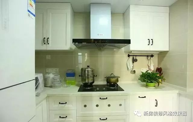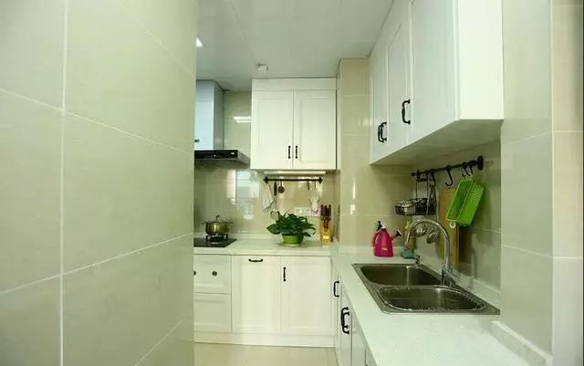 来看厨房,比预期能大一点,灶台和水槽,设在两个台面上,先来看灶台区域,墙壁上还最大程度装了吊柜,冰箱放在橱柜延伸处,只要放在厨房,就感觉能方便很多。