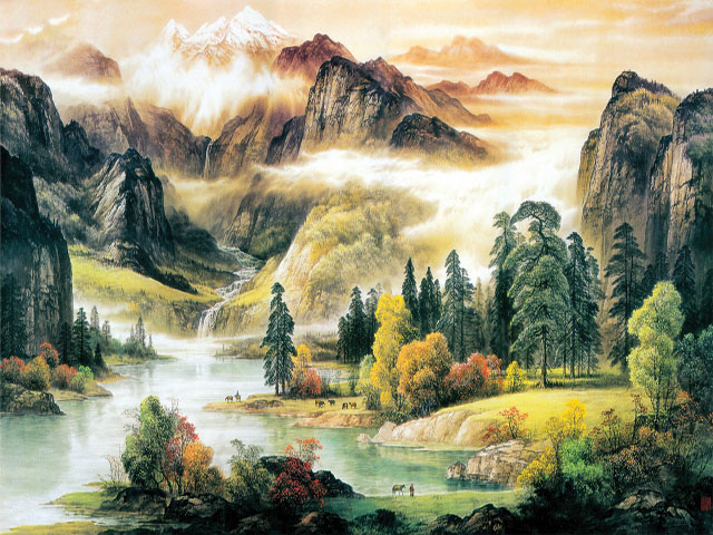 而相对来说,中式田园风格就相对简单了,因为古人向来提倡亲近山水,与鱼虾作伴,所以中式田园风格装饰画表现出的就是陶渊明诗中所描绘的那种“采菊东篱下,悠然见南山”的悠然自得情怀,还有就是村屋散落,袅袅炊烟升起的农家生活闲趣。