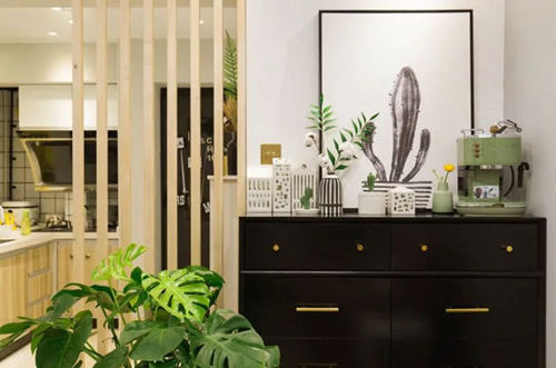 家具是比较整体的风格,电视柜、餐桌椅、沙发、小茶几,风格是跟隔断和厨房柜子的颜色搭配的。一体化很强。尤其电视柜,设计成了能伸缩的,可根据家居摆放来调整长度,缩到最短的时候,两边都能留出空位摆植物。还有一种设计,那就是做一个才有储物功能的背景墙,好处是储物功能更强大。这家业主储物应该够用了,选择了这个设计也是非常不错。
