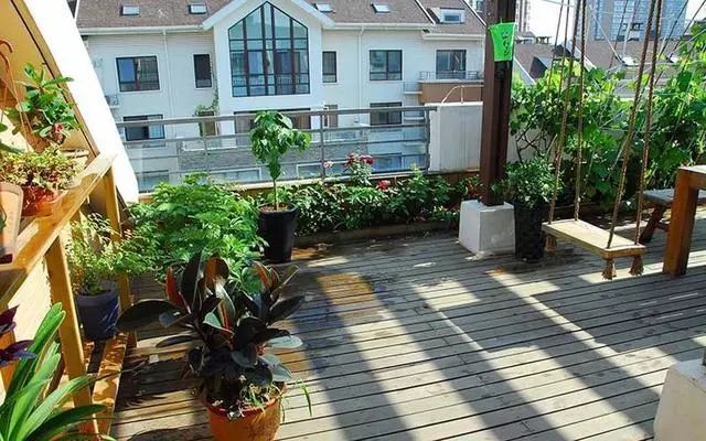 这套方案看上去就更加的惬意了,实木的地板搭配上周围的花架,整个阳台看上去非常的清新有格调,另外在阳台上还有一个秋千的设计,身处花卉的包围,荡着秋千,眺望远方,想想是多么惬意的一件事情。