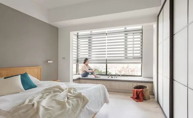 卧榻设计有收纳的功能。舒服的配色 + 明亮的采光与景色,让每天休息放松的卧室,更多了疗愈的感觉。