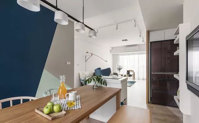 将餐厅背墙以几何切块作切割,调配上丰富色彩,利用黑板漆与磁铁板,让墙面兼具涂鸦墙与记事板功能,相当独有巧思且有趣味的贴心设计 。