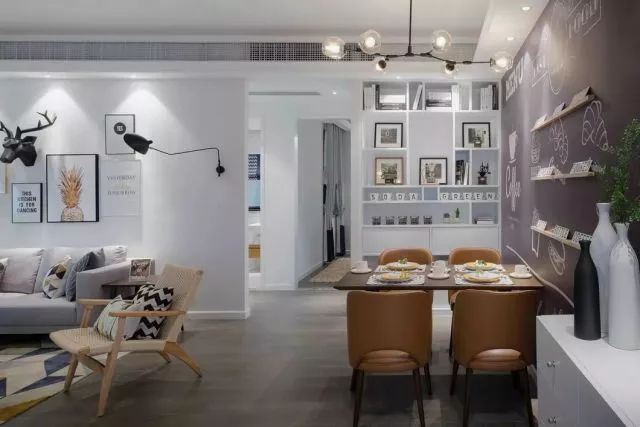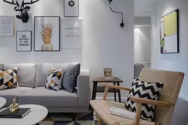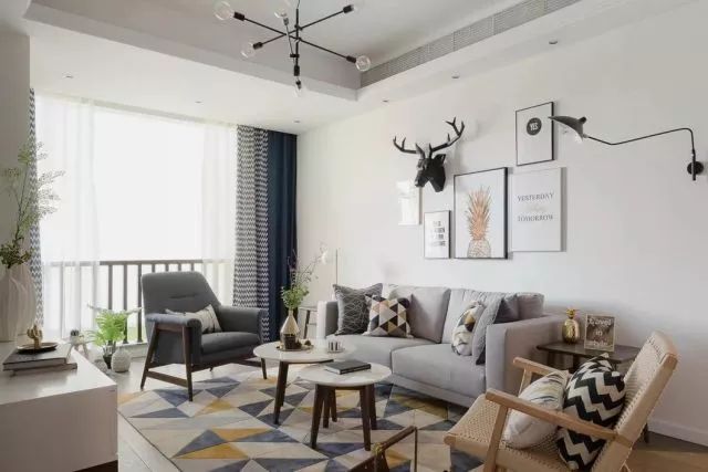 沙发背景墙上的黑色麋鹿头是客厅的一大亮点,搭配白色的墙面,就像穿行在北欧迷雾丛林里的小鹿走出了森林,看见了蓝天白云。