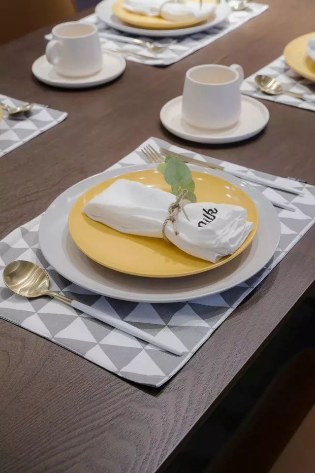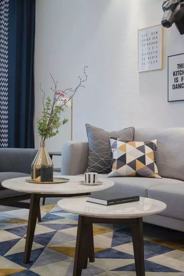 灰色的布艺沙发,搭配高矮的实木茶几,金色花瓶里蓬勃生长的绿植,温馨惬意的待客空间被勾勒出来,几何的地毯和同样元素的抱枕,个性十足。