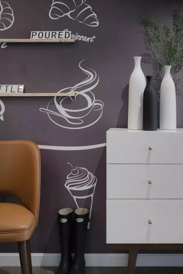餐厅的墙面采用了北欧风的黑板墙+墙绘来装饰,小隔板把各种食物的名称用英文标出来,白、紫、棕,色彩的搭配,让餐厅的氛围变得活泼欢快。