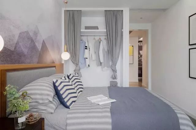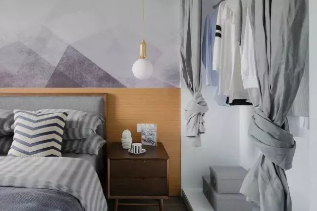 主卧清新素雅的床铺和床头背景墙,让空间中缓缓流出清澈的光。浅色卷起的衣柜帘子,随意而洒脱。