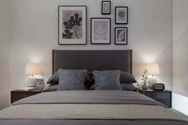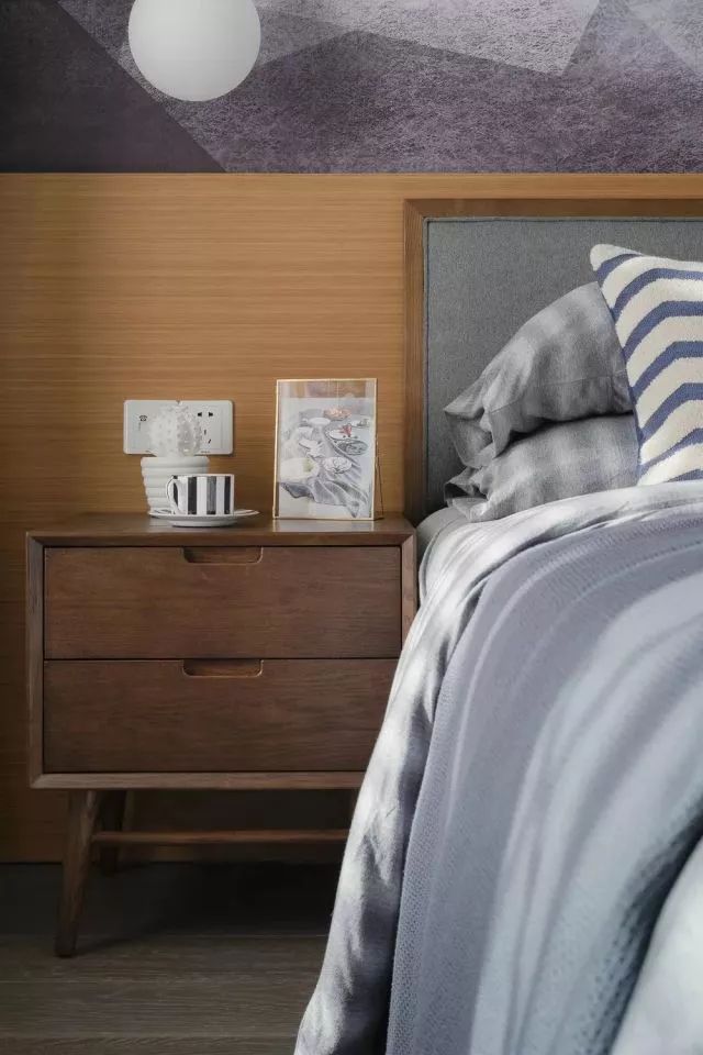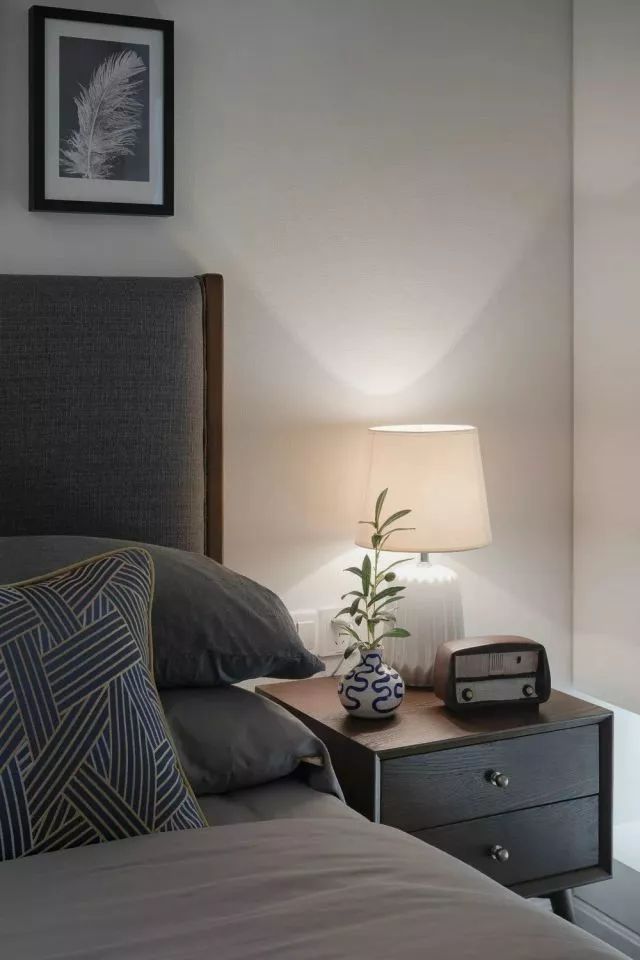 次卧室是为父母准备的房间,使用了暗色调的家具,让年老的父母更加舒适,床头背景墙上的叶子挂画,表达着老人对生活的淡然。