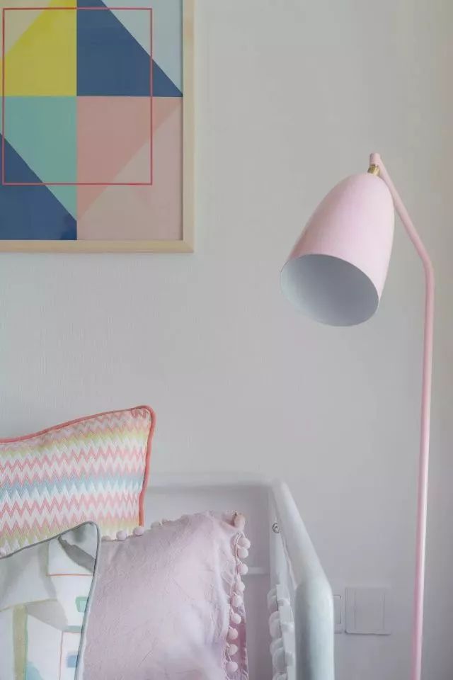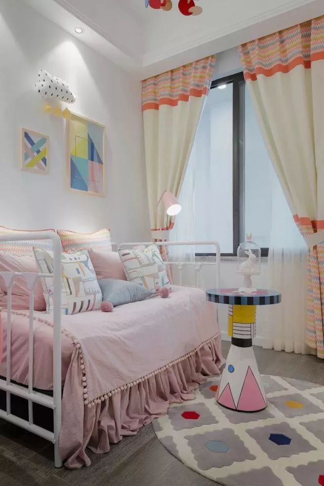 儿童房五彩的几何图形,趣妙横生,粉嫩嫩的颜色,等待着公主的降临,橙色调的窗帘,让空间丰富多彩。