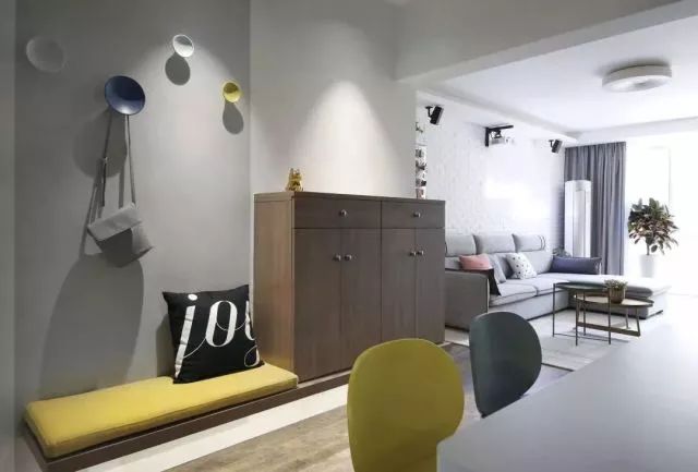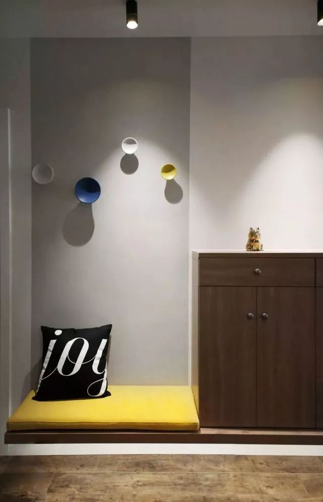 换鞋座与鞋柜都做了挂墙式,没有落地柜脚的障碍,扫地擦地顺畅很多;由于门厅光线弱,柜体离地也有利于客厅的光线更多的传递到门厅。当然辅助光源一样不可少。
