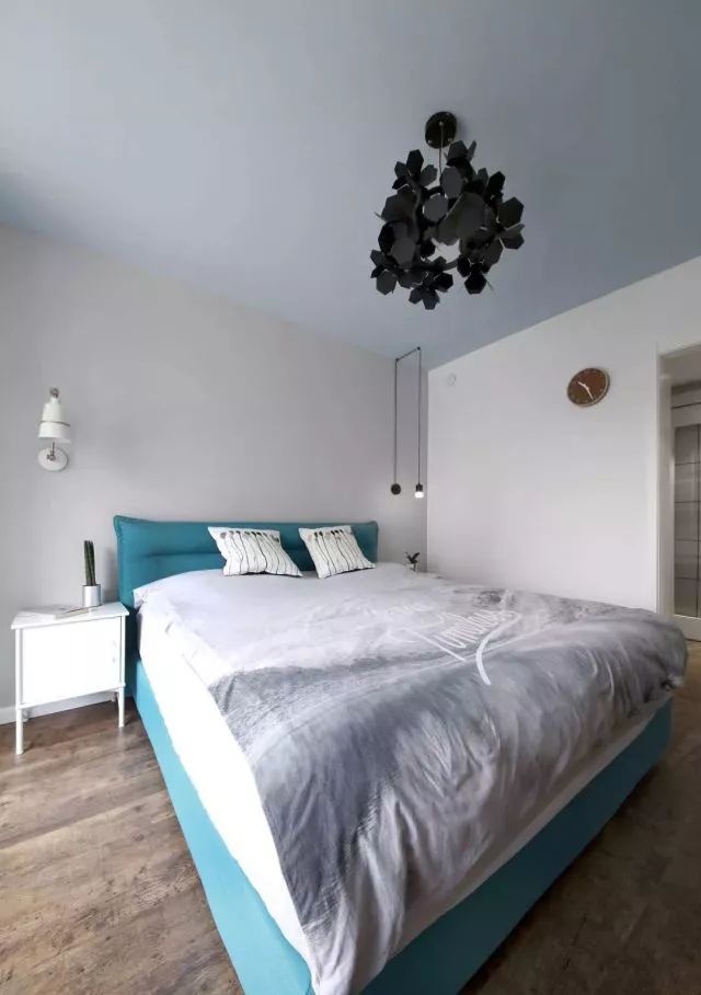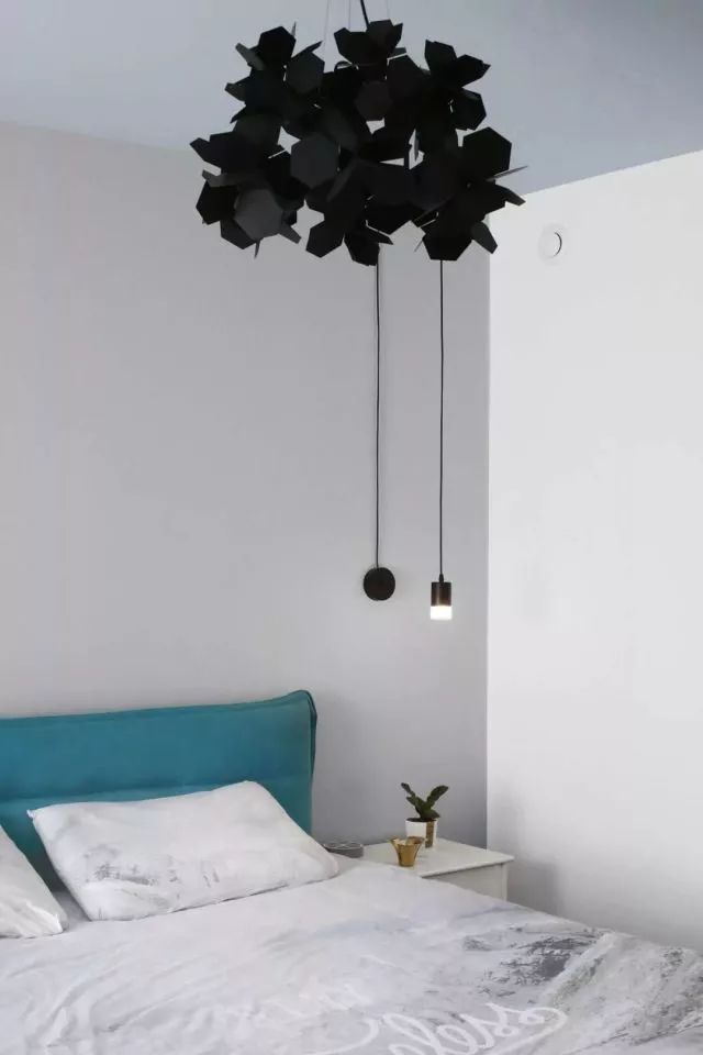 屋顶没有像以往的北欧一样做成白色的,灰蓝色搭配黑色的羽毛吊灯也很好看,不是吗?