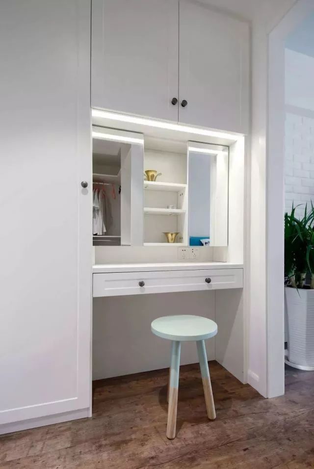 利用主卧富裕的面积加出来的衣帽间兼梳妆区,有单独的灯光照亮梳妆区。