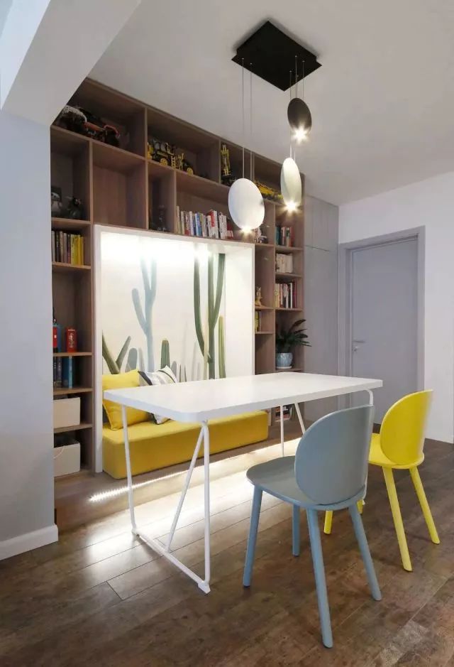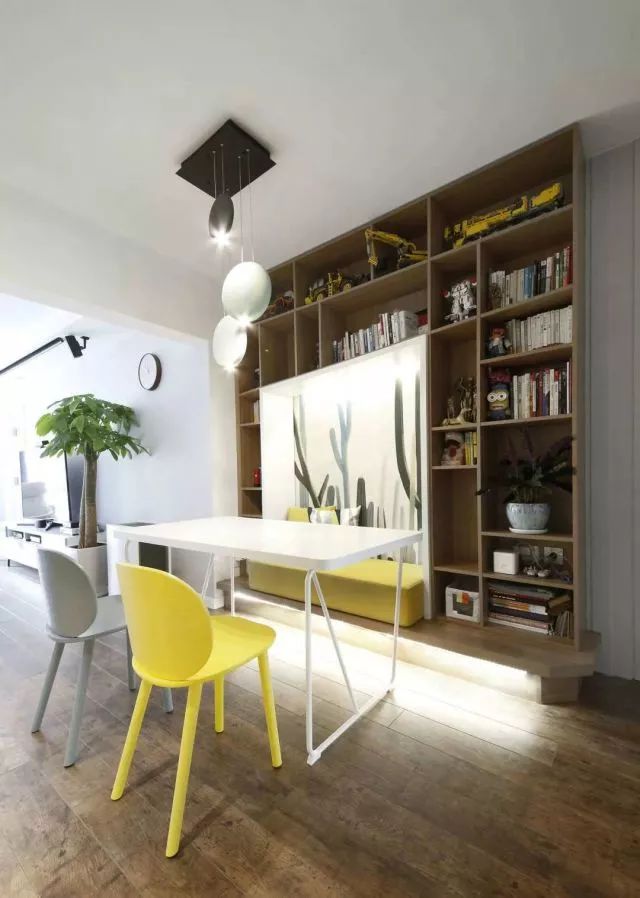 次卫的门正对进户门同时又位于餐厅范围内,所以做了整面墙的墙板来配合隐形门,尽最大可能得弱化次卫的存在感。同时餐桌位置也可以兼顾书房,一排书架方便学习和看书时光。