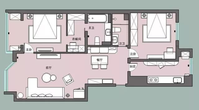 本案原始户型是很常见的两居室,优势是南北通透,但是整体偏狭长,致使中部区域(餐厅门厅区域)光线较暗,所以这个区域需要着重处理灯光与色彩方面。主卧原格局面积大,但门的位置靠近入户门,从楼道就能看到床,所以也进行了改造。