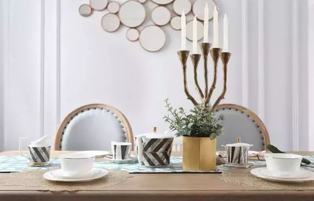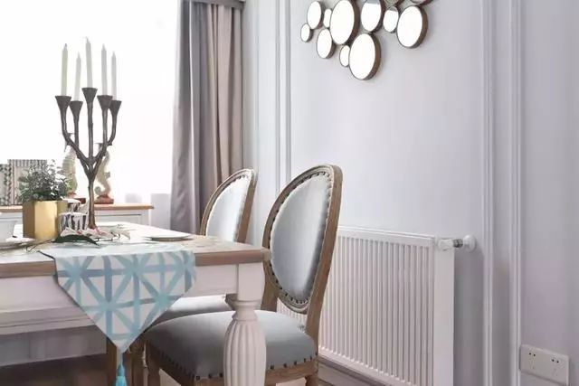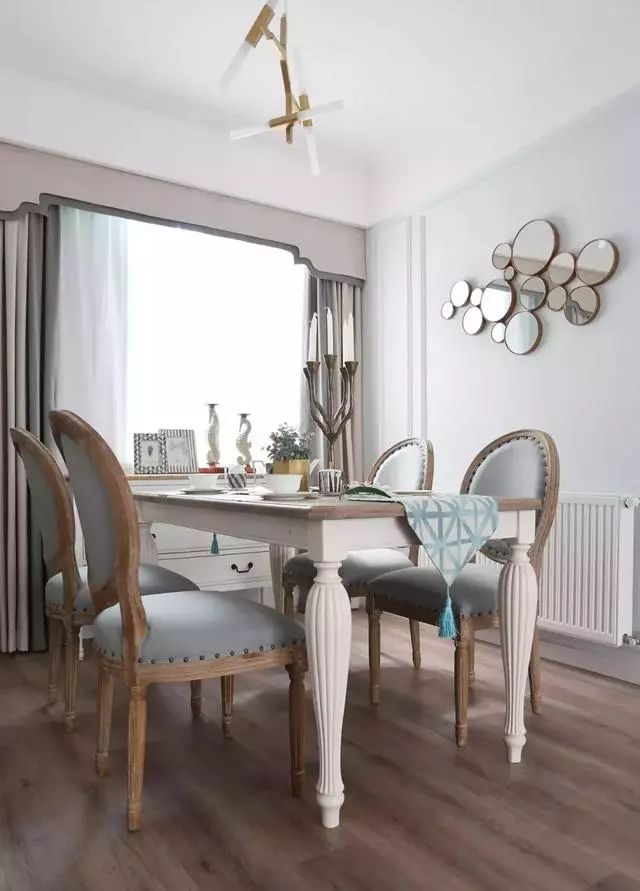 ▲餐厅光线非常好,淡淡的蓝点缀其中,很是清新。背景墙上那些大大小小的圆镜,是很有创意的装饰。