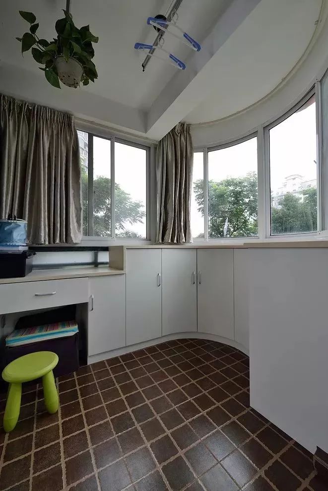 如果你想要改成一个休闲阳台,那更是不能错过柜子了,一个圆弧形的不规则阳台,一整排的地柜,至少多出8个平方的储物空间!