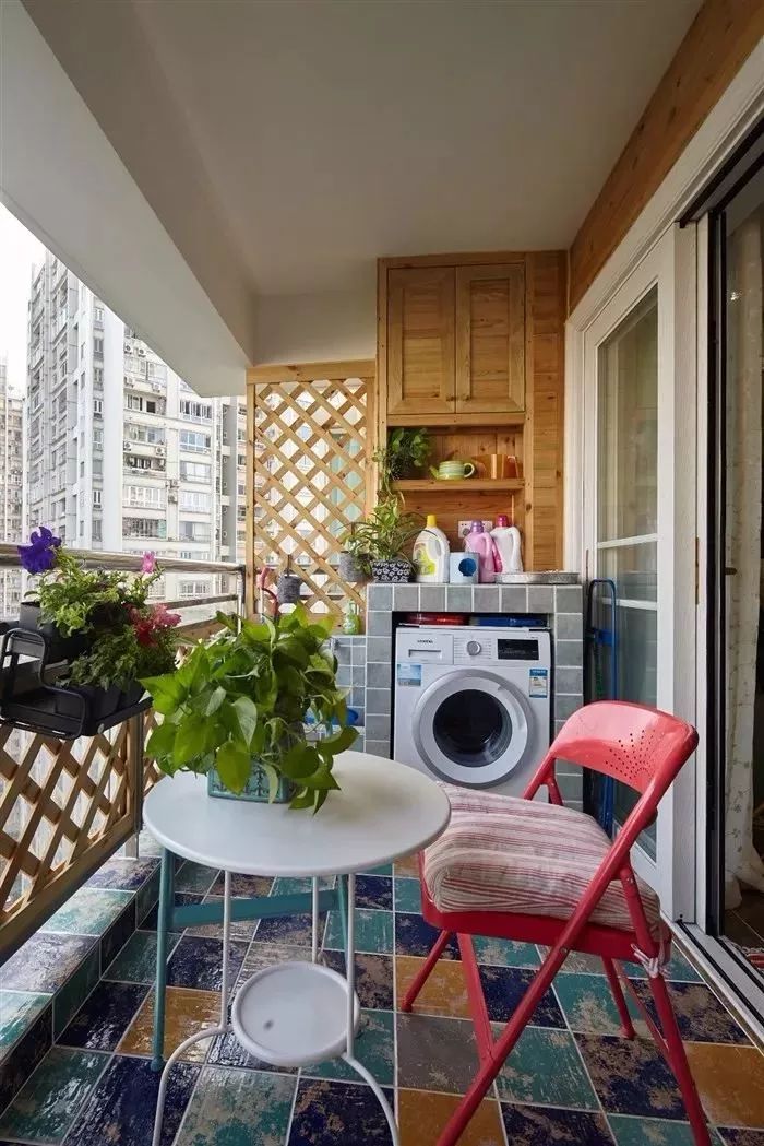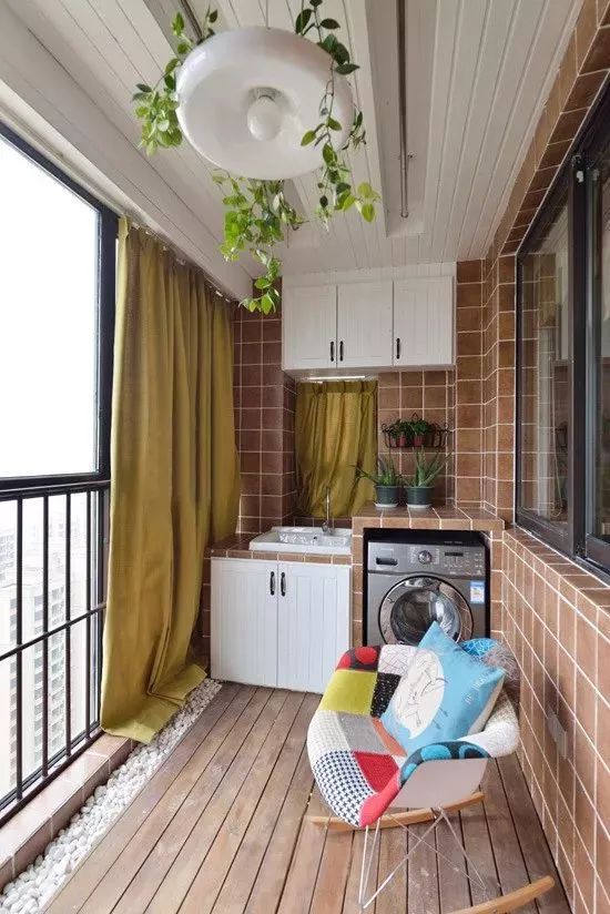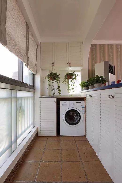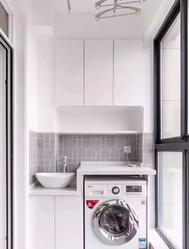 而且如果你的阳台打算全都利用起来,可以把一侧做洗衣机加洗手池,另一侧做满墙的柜子,这样的柜子也会比较常用。