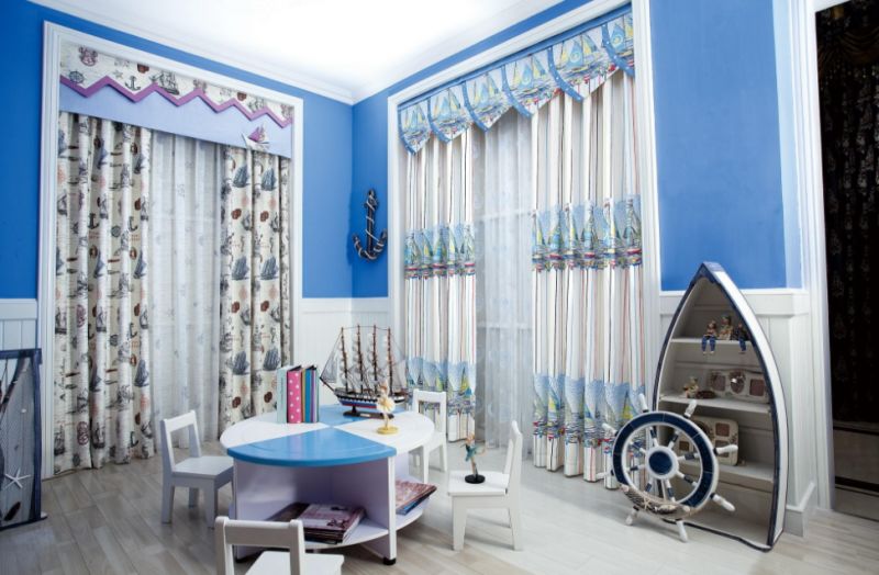 蓝色的墙纸与咖啡色的窗帘搭配,再配上偏白色的沙发,整个地中海式风格的家居就尽收眼底。