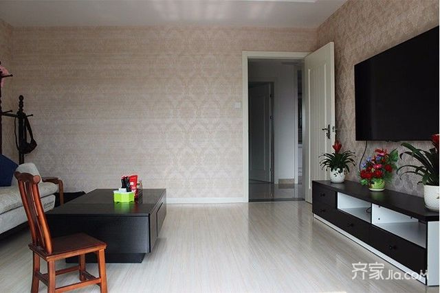 浅色的木纹地板,搭配米色的欧式花纹壁纸,使得整个空间更加和谐干净。