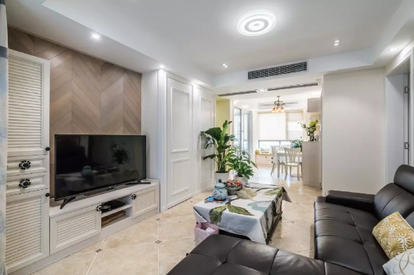 客厅是典型的简美风格。白色的墙壁、储物柜、复古感十足的地砖,让客厅显得精致有质感。
