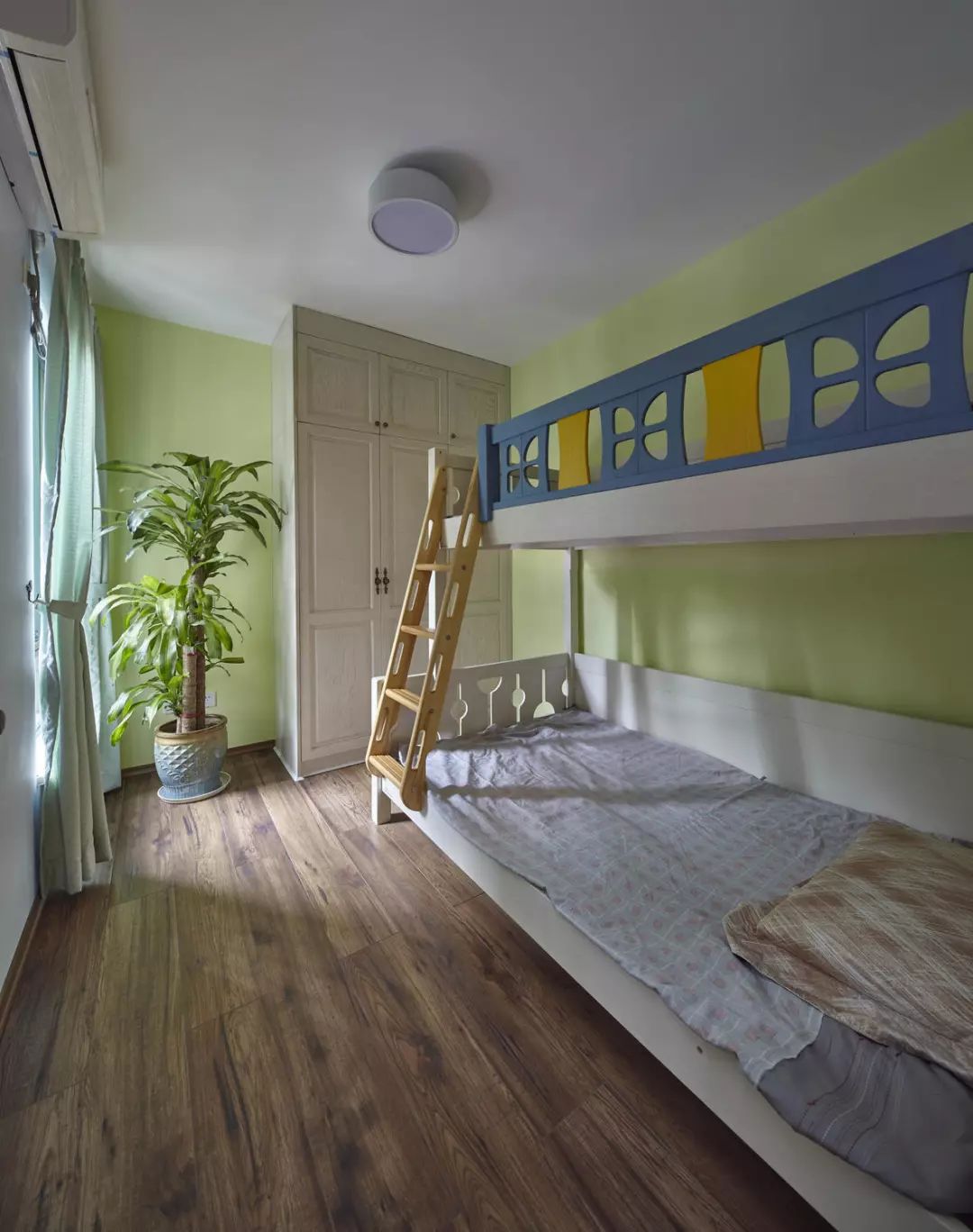 小孩房,左边一面墙是浅蓝色的因角度问题色彩就不太明显;现在放植物的地方预留了插座以后给小孩子放书桌