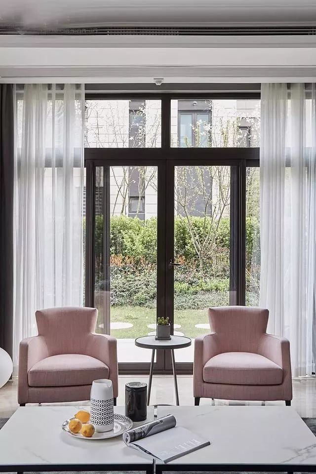 经典而简练的黑边,优雅地点缀了纯白的茶几台面,符合着空间对于品质的追求