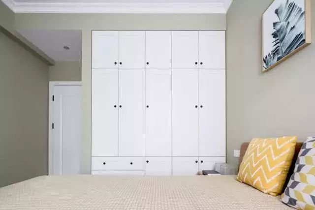 主卧衣柜采用的嵌入式设计,造型简单,对开门的样式也是更加高档实用,也方便了卫生的清理;