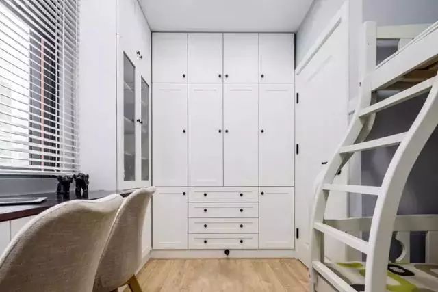 儿童房,采光和通风都不错,摆放的高低床,为二胎做好了准备,而墙面设计整面衣柜和书柜,集学习,收纳和休息于一体;