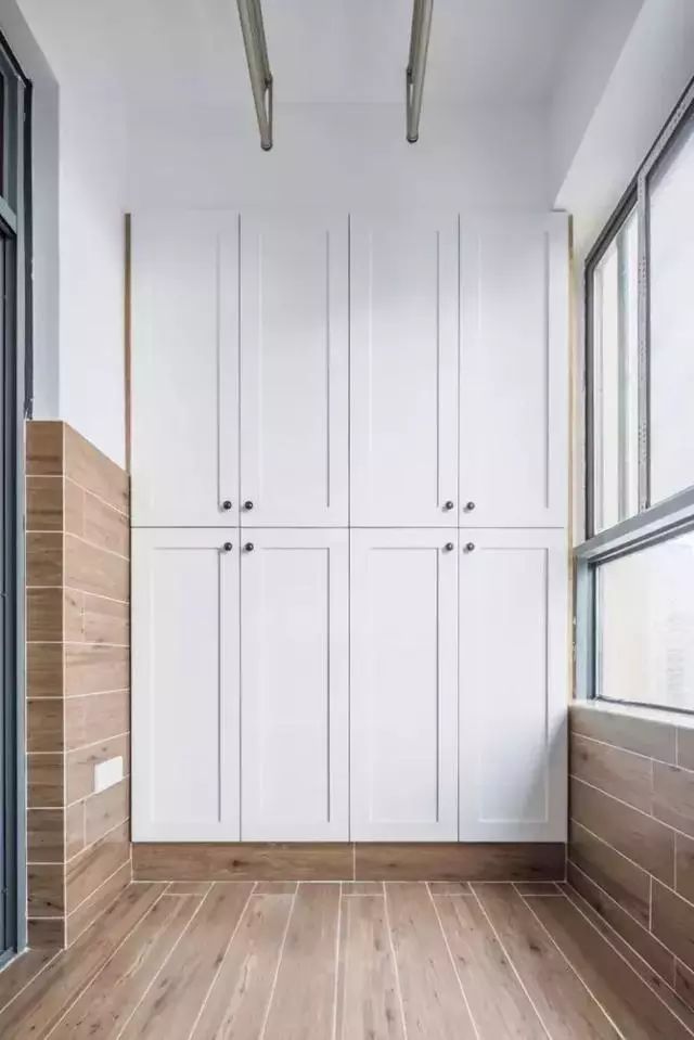 阳台,面积还是比较大的,墙地面都是铺的瓷砖,有效的防水,而一侧是设计的4开门收纳柜,提供了足够的收纳储物空间;