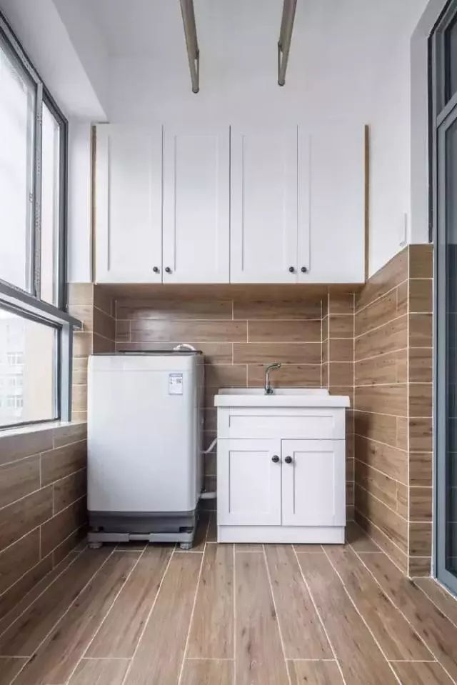 阳台的另一侧则是设计的吊柜和洗衣柜,方便了日常的洗晒用品收纳,简单实用;