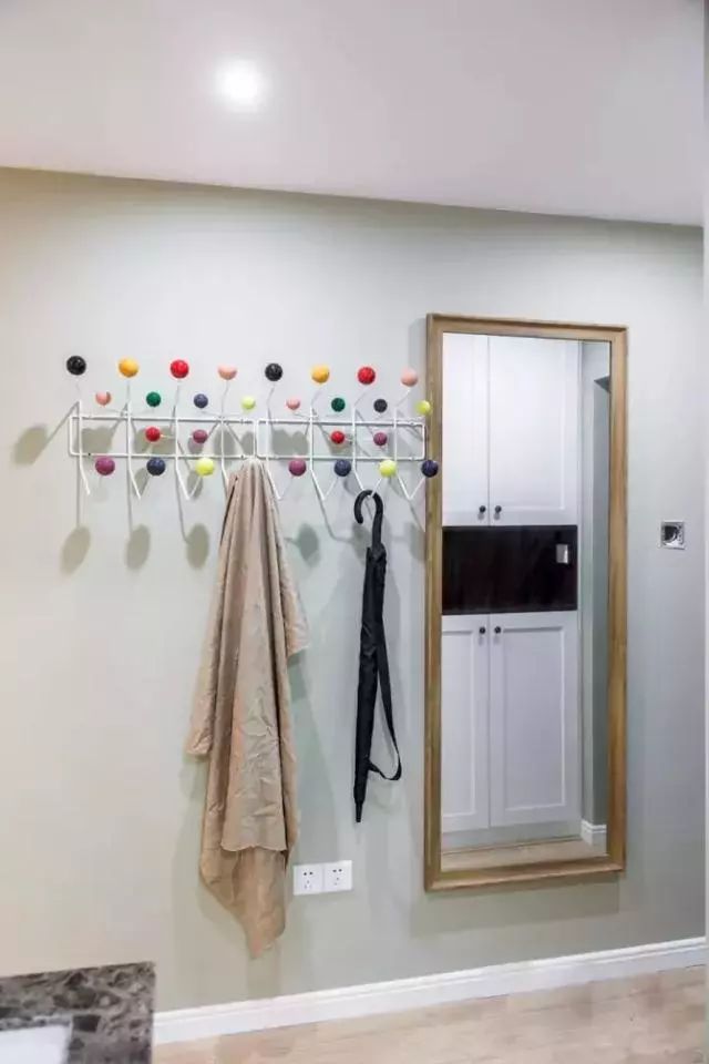 入户玄关,进门左侧设计的整面柜子,分为上下两个部分,中间掏空的设计,而右侧则是安装的全身镜和挂钩,方便了日常的进出;
