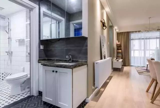 卫生间,刚干区安装在卫生间外面,真正的做到了干湿分离,白色浴室柜和灰色墙面瓷砖的搭配,清新又大气;